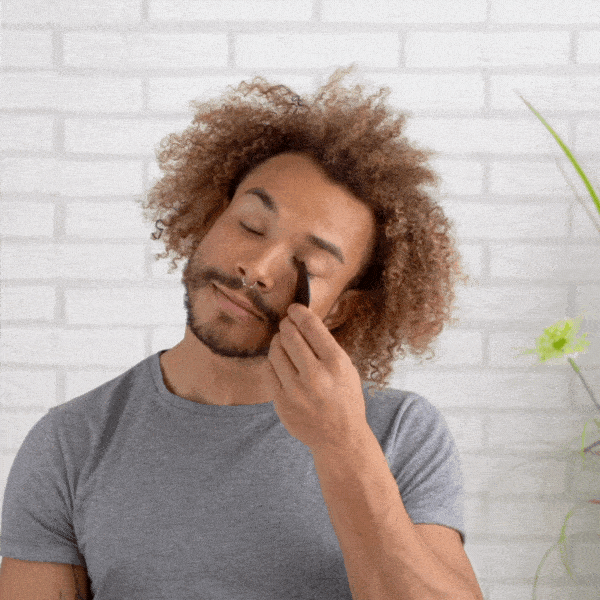 Step 3: Follow with the eye roller, gently gliding from the inner corner outward along the brow bone and under the eyes.